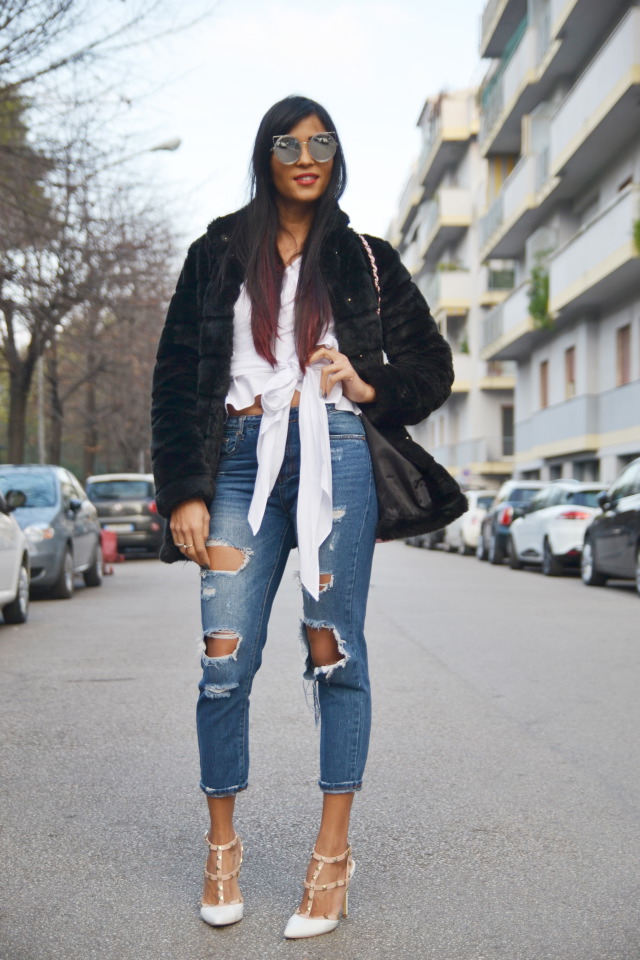 Allora, nel look di oggi, indosso una camicia bianca con le maniche larghe, che é la tendenza del momento, con dei jeans e scarpe chiuse di color bianco proprio per abbinarle alla camicietta...