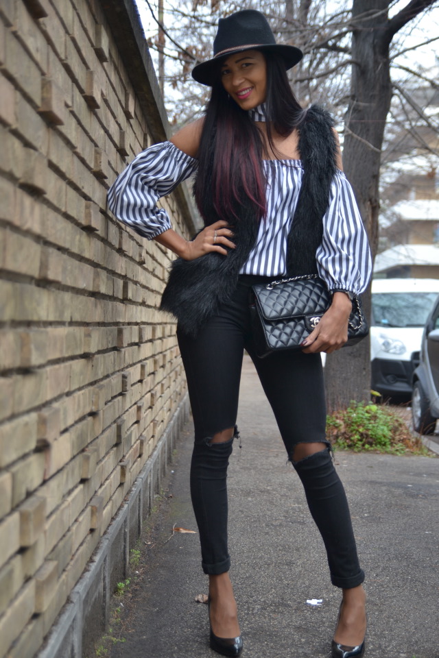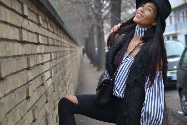 No post de hoje eu escolhir essa de listras preta ombro a ombro que veio acompanhada com a sua choquer, mas se como estava muito frio aqui na minha cidade eu resolvir usar com esse gillet por cima que foi o que deu uma esquentada, mas não cobriu o detalhe da camisa….